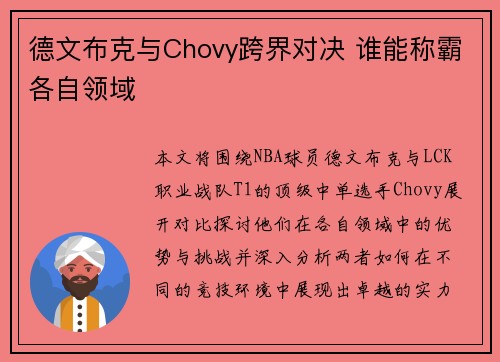 本文将围绕NBA球员德文·布克与LCK职业战队T1的顶级中单选手Chovy展开对比,探讨他们在各自领域中的优势与挑战,并深入分析两者如何在不同的竞技环境中展现出卓越的实力。德文·布克作为NBA的明星球...