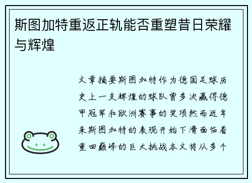 文章摘要:斯图加特,作为德国足球历史上一支辉煌的球队,曾多次赢得德甲冠军和欧洲赛事的奖项。然而,近年来,斯图加特的表现开始下滑,面临着重回巅峰的巨大挑战。本文将从多个方面探讨斯图加特是否能重返正轨,重...