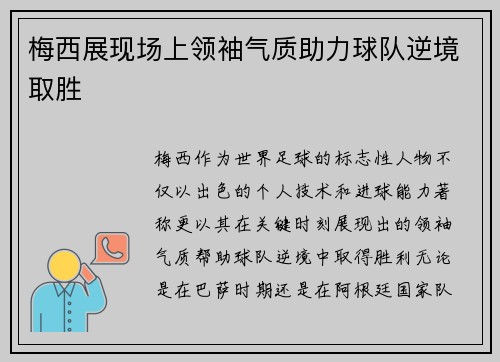 梅西作为世界足球的标志性人物,不仅以出色的个人技术和进球能力著称,更以其在关键时刻展现出的领袖气质帮助球队逆境中取得胜利。无论是在巴萨时期,还是在阿根廷国家队,梅西总能在比赛的关键时刻挺身而出,带领队...