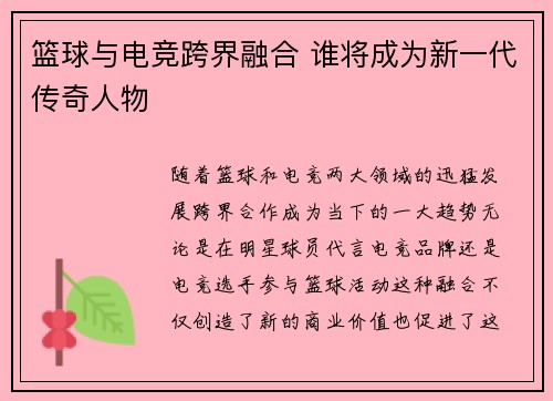随着篮球和电竞两大领域的迅猛发展,跨界合作成为当下的一大趋势。无论是在明星球员代言电竞品牌,还是电竞选手参与篮球活动,这种融合不仅创造了新的商业价值,也促进了这两个领域的文化碰撞。尤其是在年轻一代的喜...